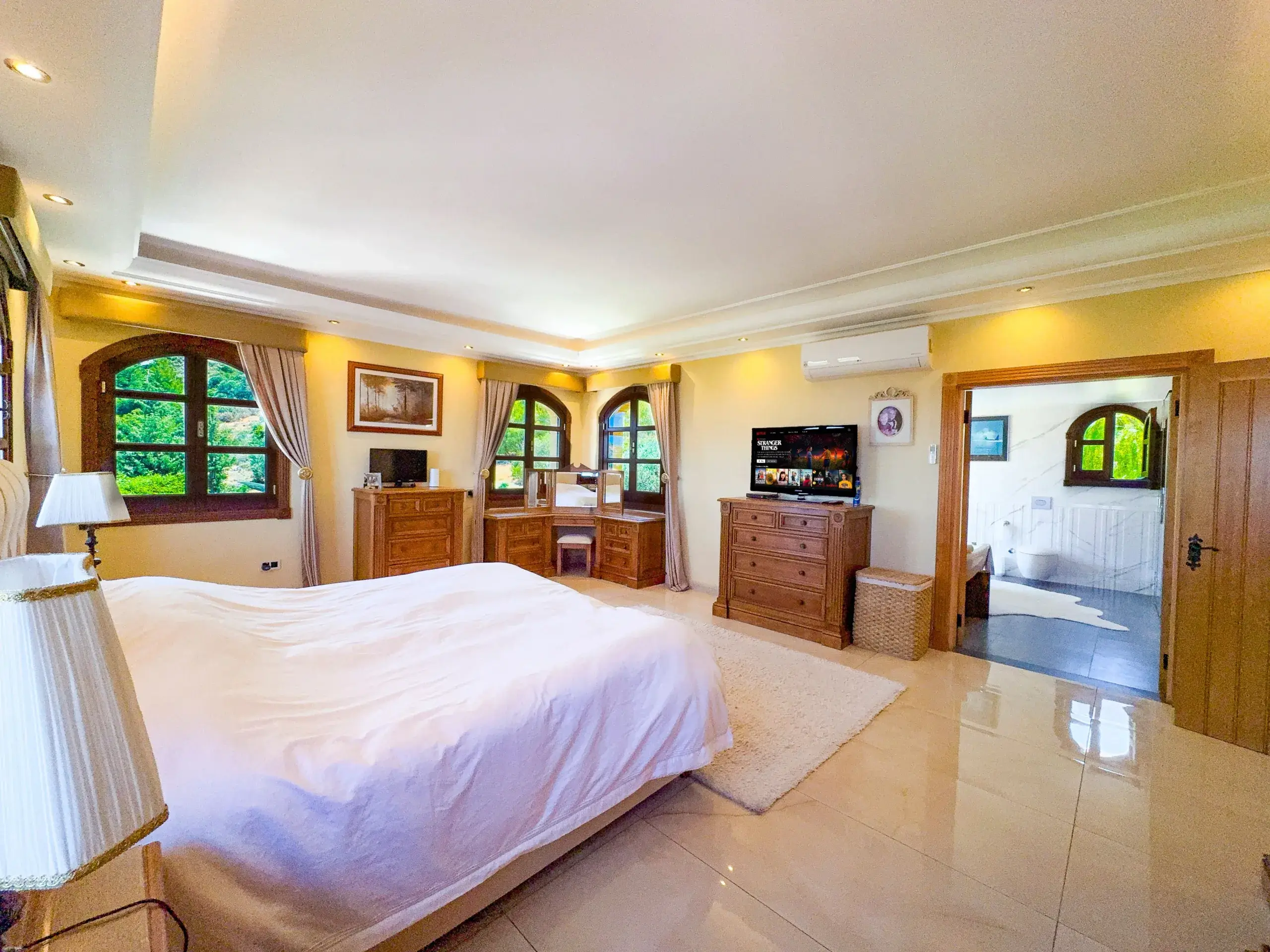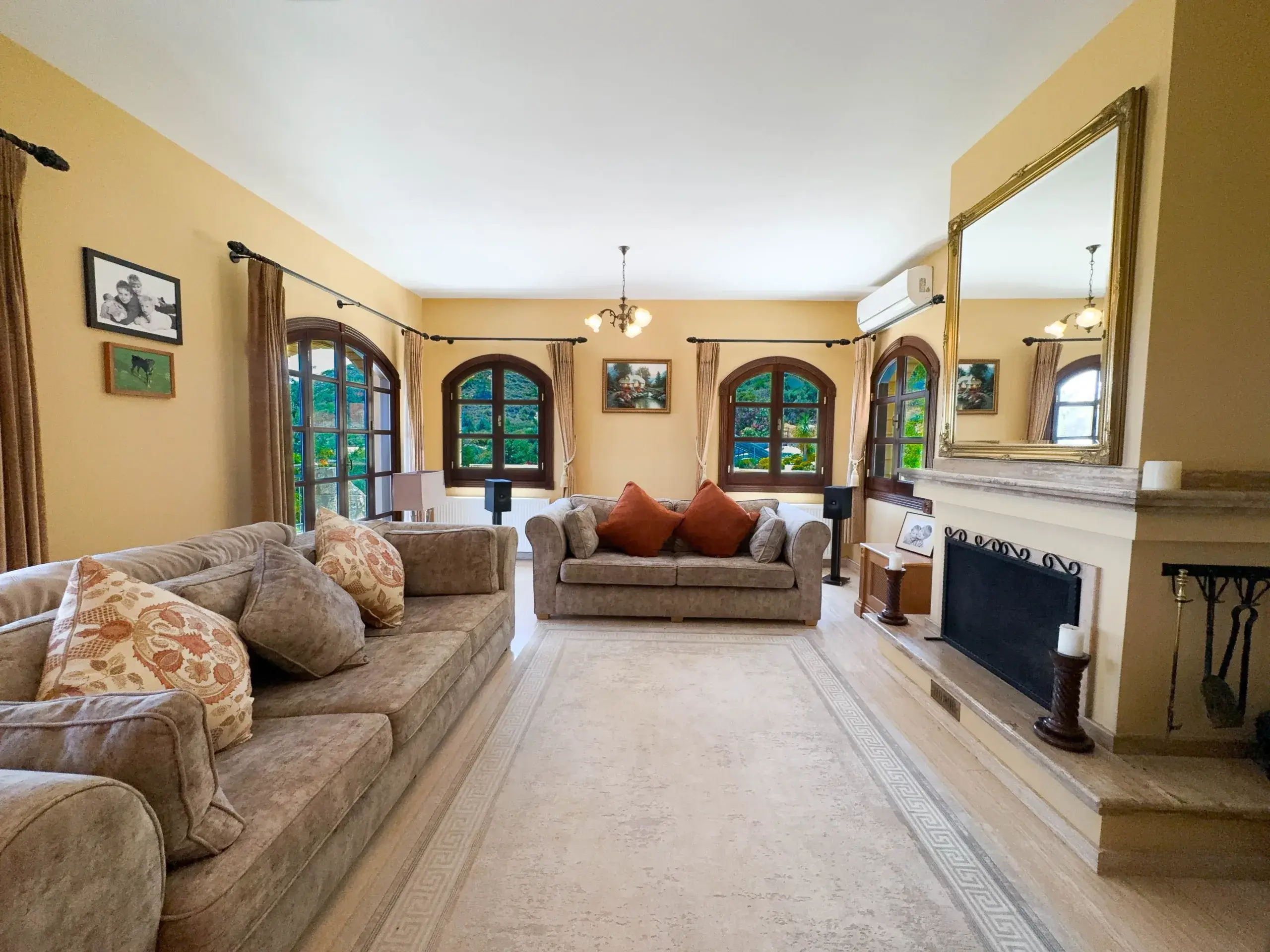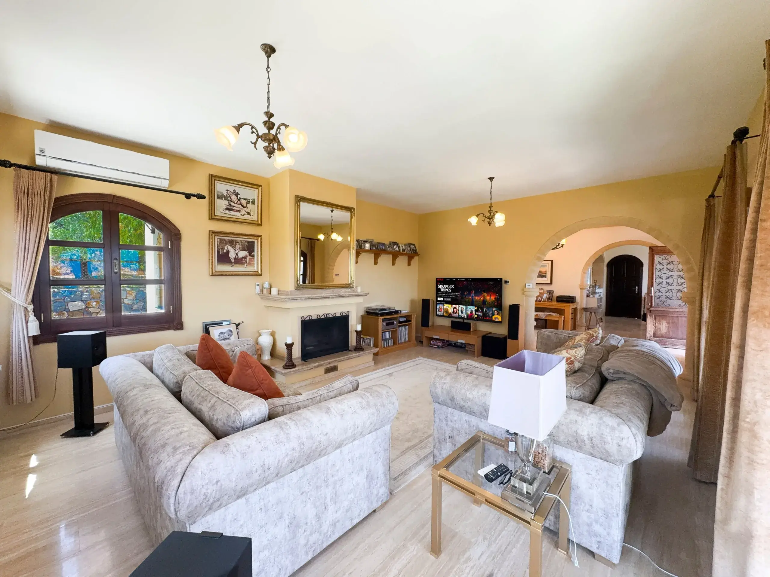 - Wohnkomfort: Lichtdurchflutete Räume mit Steinböden, ein eleganter Marmorkamin und moderne Inverter-Klimasysteme sorgen das ganze Jahr über für ein perfektes Raumklima.