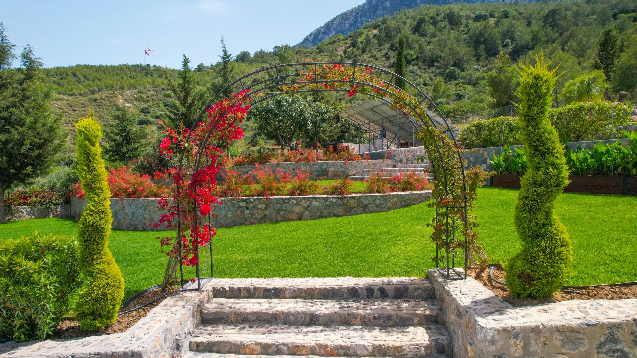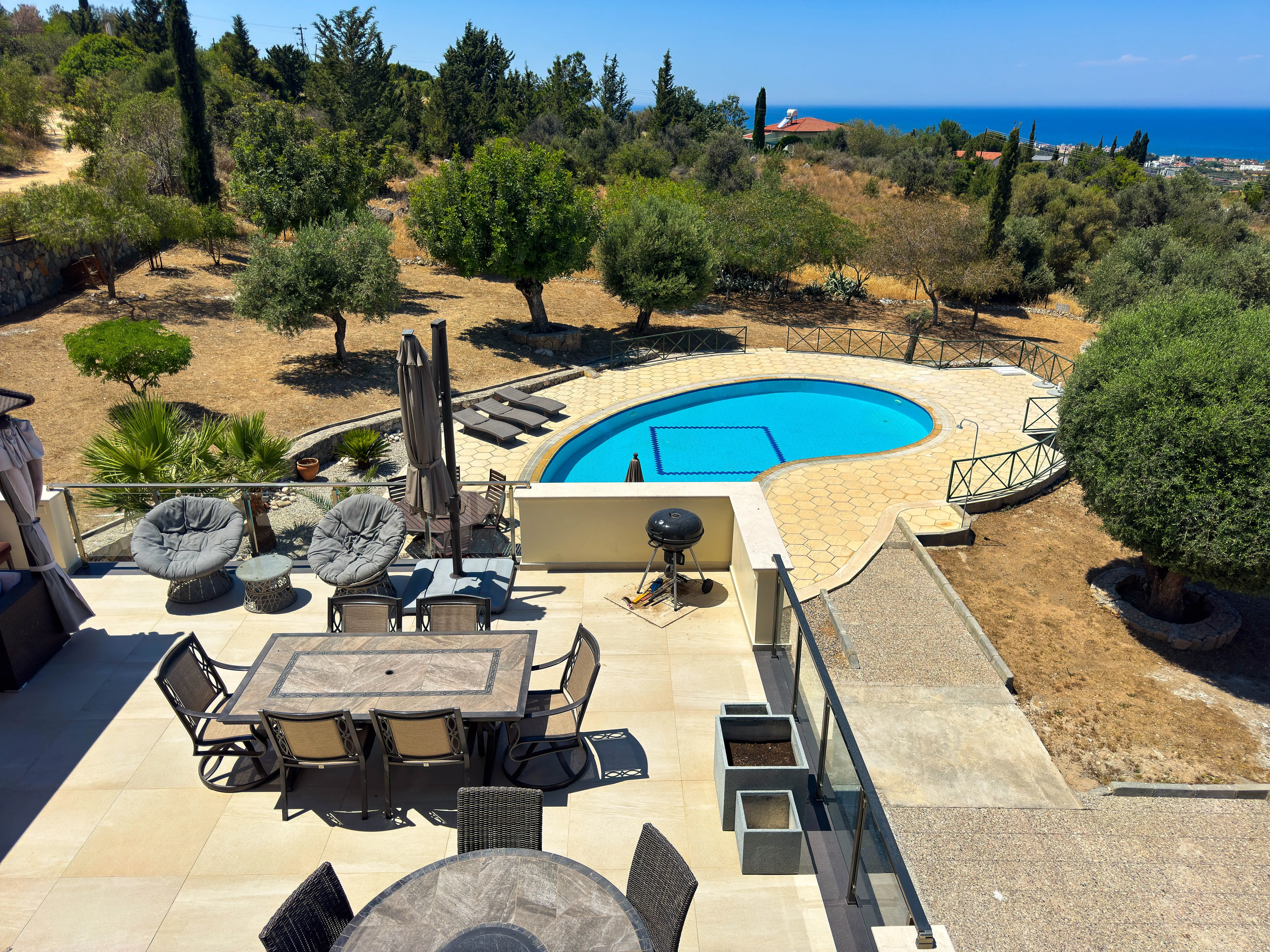 Das weitläufige Grundstück ist eine grüne Oase. Der einzigartig geformte Privatpool wird durch eine eigene Solaranlage betrieben, was die Unterhaltskosten minimal hält. Die Gartenanlagen sind terrassenförmig angelegt und bieten zahlreiche Rückzugsorte für entspannte Stunden im Freien.
