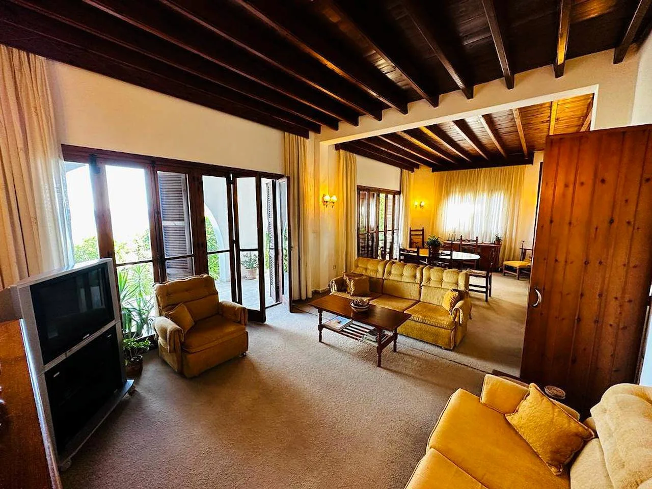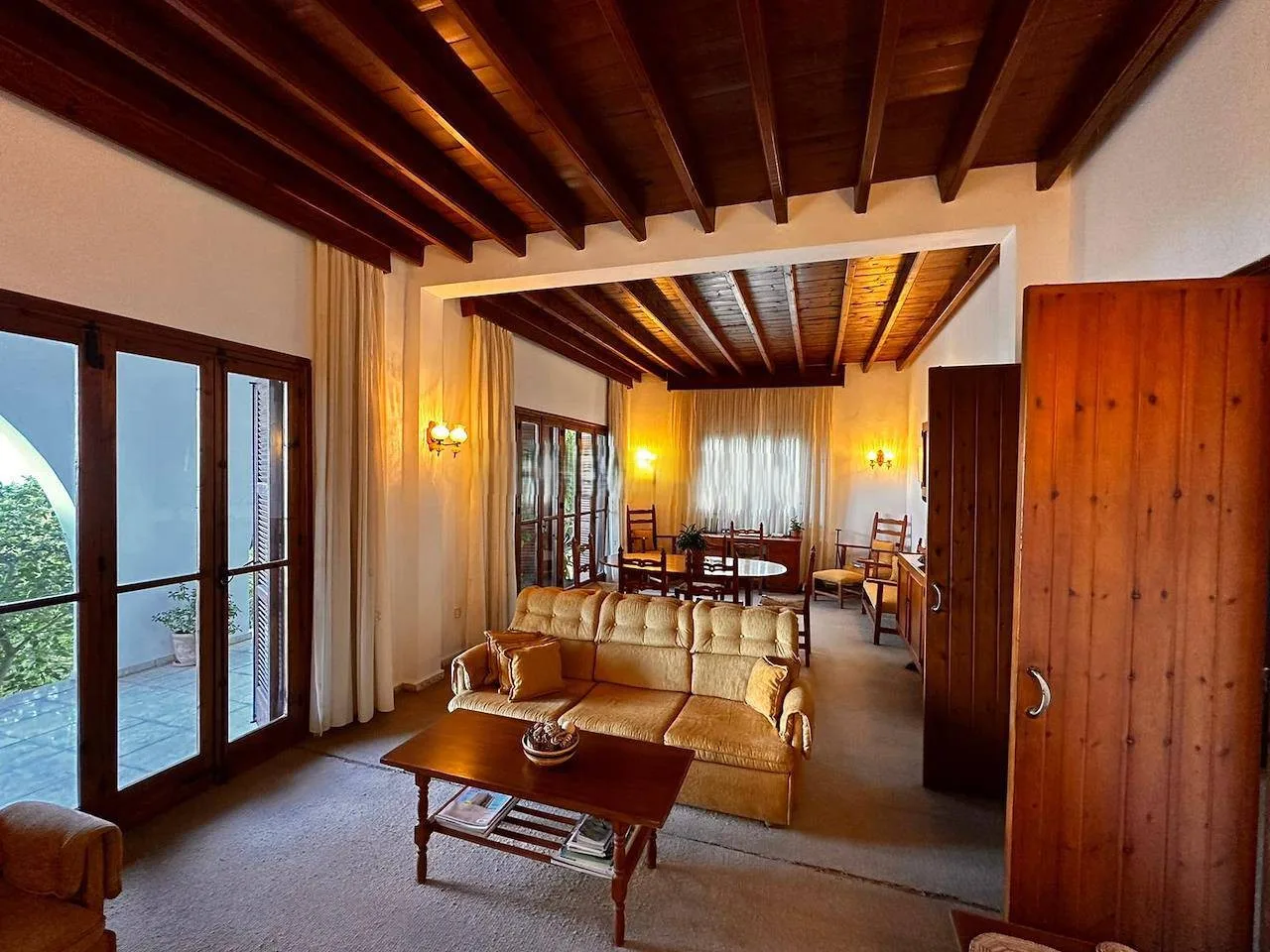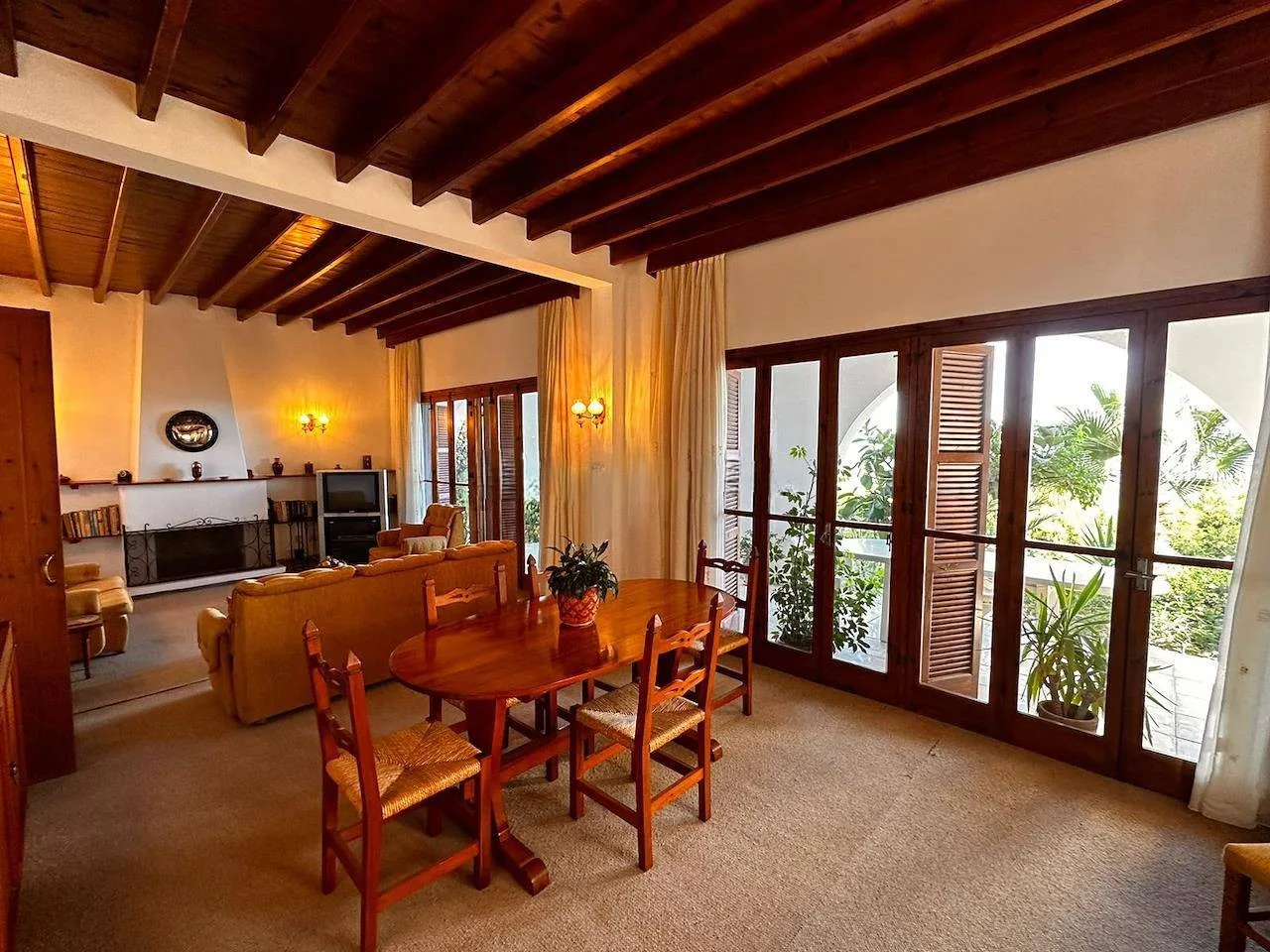 Das Herzstück des Hauses ist das großzügige, offene Wohn- und Esszimmer mit einem gemütlichen offenen Kamin, rustikalen Holzbalkendecken und hochwertigen Bodenbelägen. Die separate Einbauküche aus Holz ist mit Mosaikböden, einer Frühstücksbar und Elektrogeräten ausgestattet. Große französische Türen führen direkt auf die überdachte Terrasse – der perfekte Ort für gemütliche Abende mit Blick auf das Pooldeck.