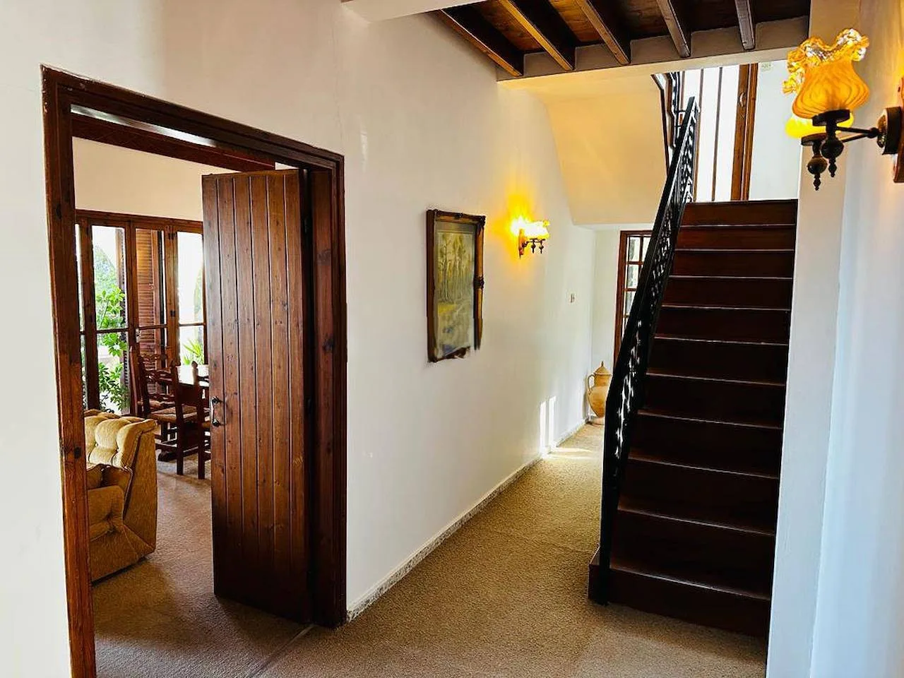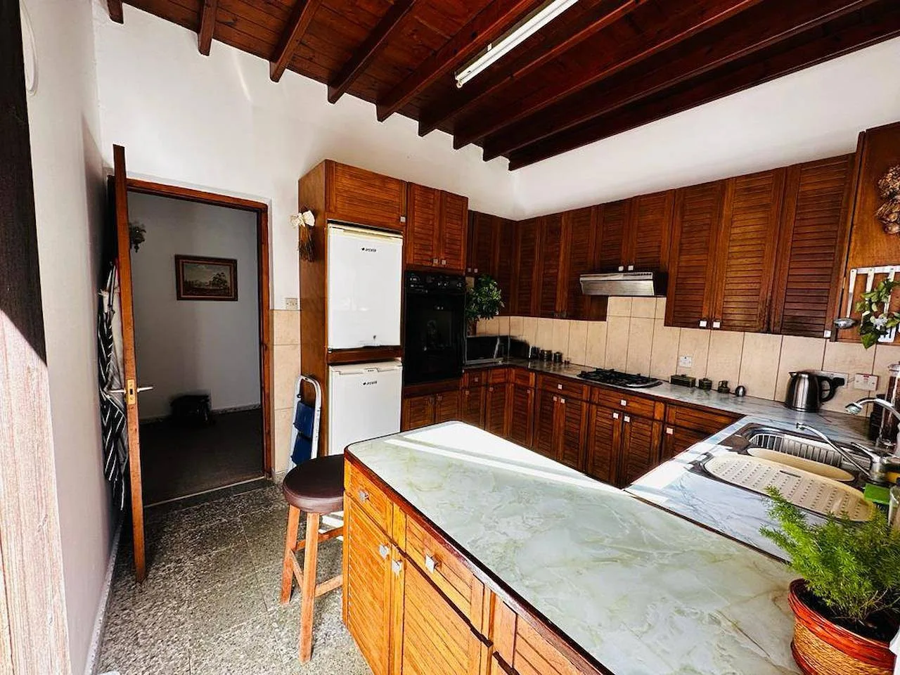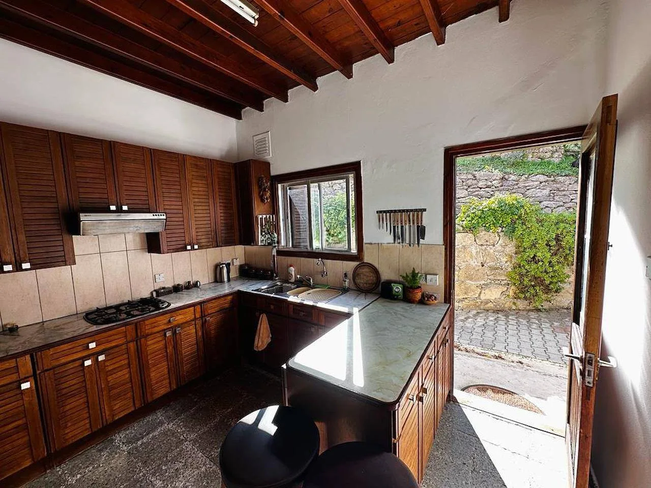 Das Herzstück des Hauses ist das großzügige, offene Wohn- und Esszimmer mit einem gemütlichen offenen Kamin, rustikalen Holzbalkendecken und hochwertigen Bodenbelägen. Die separate Einbauküche aus Holz ist mit Mosaikböden, einer Frühstücksbar und Elektrogeräten ausgestattet. Große französische Türen führen direkt auf die überdachte Terrasse – der perfekte Ort für gemütliche Abende mit Blick auf das Pooldeck.